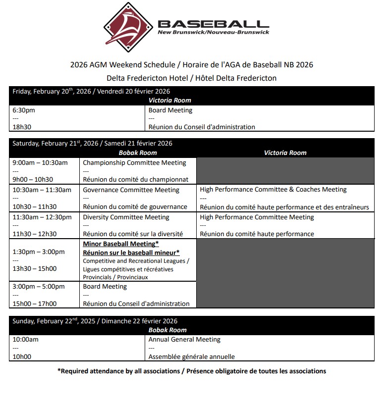 The 2026 Baseball NB AGM will take place on Sunday, February 22 10:00am at the Delta Fredericton.